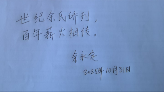 这次省亲已是余教授第三次回故乡。他第一次回乡是在2016年7月,在时任风采月刊社副社长余焕权、常委余锦辉等人的协助下,余永定教授寻找到旧居。自此以后,他与《风采月刊》经常保持联系。2024年11月,余永定教授应邀回到江门市作经济专题讲座,并再次回乡省亲。在今年风采月刊社筹备《风采月刊》创刊100周年庆典活动期间,余民发社长、余焕权总编辑诚邀他出席庆典活动,并为本社编写的《百年侨刊 风采悠长——〈风采月刊〉创刊100周年纪念特刊》(以下简称《百年风采》纪念特刊)题写贺词,他爽快地答应了,并亲笔写下12个刚劲有力的钢笔字——世纪余氏侨刊,百年薪火相传,使纪念特刊增添了光彩。