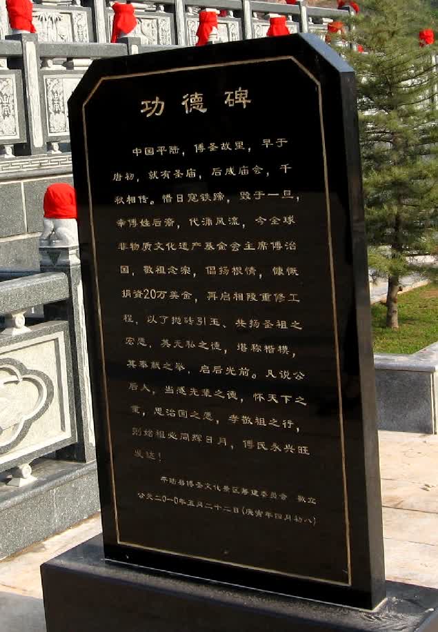 中国平陆,傅圣故里,早于唐初,就有圣庙,后成庙会。日寇铁蹄,毁于一旦,幸傅氏后裔,代涌风流,今全球非物质文化遗产基金会主席傅治国,敬祖念宗,倡扬根情,慷慨捐资20万美金,再启相陵重修工程,以了抛转引玉,共扬圣祖之弘愿。其无私之德,堪称楷模,其奉族之举,启后光前。凡說公后人,当感先辈之德,怀天下之重,思治国之德,孝敬祖之行!则始祖必同辉日月,傅氏永兴旺发达!