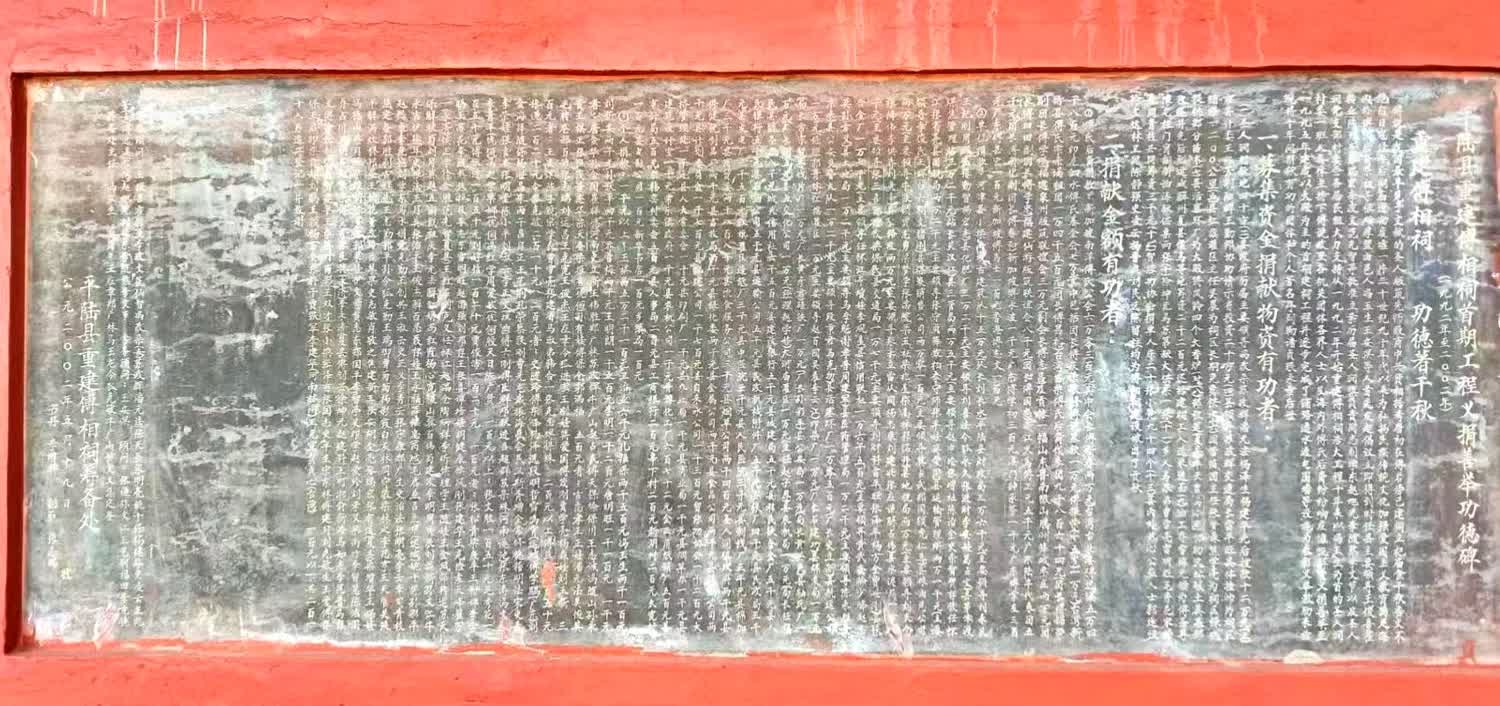 此碑文记载: 第七次,光绪三十(1904)年,平陆正堂谢沛主持并捐银30两,共筹银228两,重建了傅相祠。
