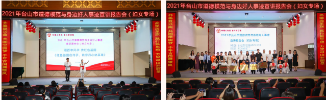 举办“巾帼心向党 奋斗新征程”2021年台山市道德模范与身边好人事迹宣讲报告会(妇女专场),报告会通过台山市妇联党组书记、主席林如宝进行学习贯彻习近平总书记在中国共产党成立100周年大会上重要讲话精神专题宣讲、侨乡红厨娘“讲家史 说家风”讲优秀家庭家教家风故事、访谈新时代台山市道德模范和身边好人、红色经典朗诵以及收看绿色家庭公益宣传片等形式,教育引导妇联新一届执委在参与中接受道德教育,积极培育和践行社会主义核心价值观,引领广大家庭向幸福出发,共建幸福家庭。