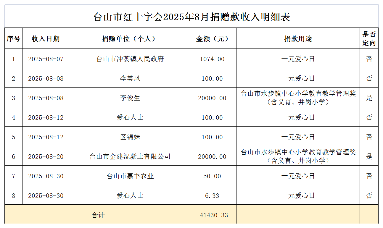 为规范台山市红十字会的信息公开行为,保护捐赠人、志愿者、受益人等慈善参与者的合法权益,维护社会公众的知情权,保证红十字会公开公正透明运行,根据《中国红十字会捐赠信息公开指南(试行)》(中红字〔2020〕23号)《广东省红十字会信息公开制度(试行)》(粤红办〔2021〕91号)文件精神,现公示台山市红十字会2025年8月捐赠款(物)收支明细。
