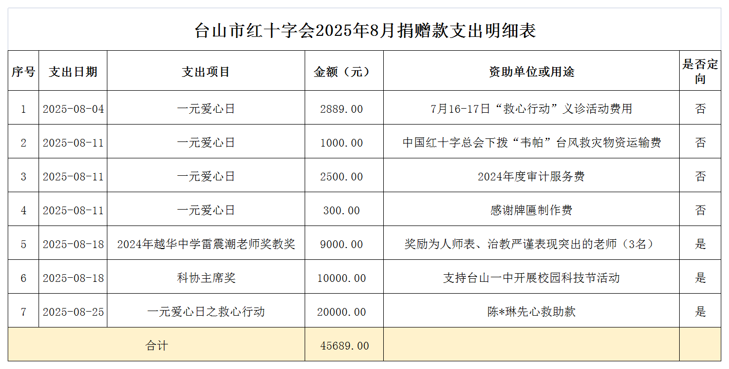 【慈善公示】台山市红十字会2025年8月捐赠款(物)收支明细公示