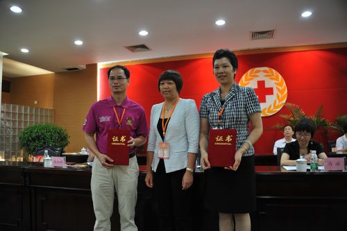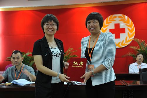 江门市红十字会常务副会长冯冰为新当选台山市红十字会第六届理事会会长陈翠芹颁发证书