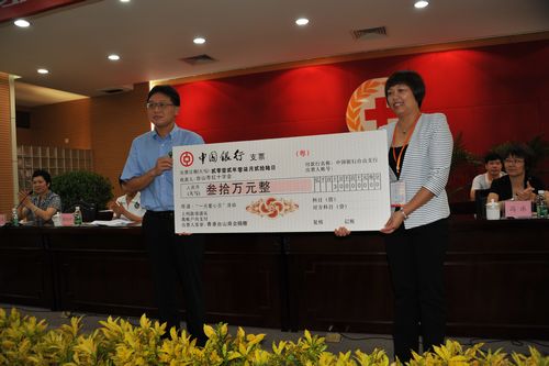 大会上,甘炳棠先生伉俪代表旅港乡亲李伯荣先生向市红十字会捐赠运送救灾物资车辆;刘祥来先生代表香港台山商会捐赠30万元,资助我市困难家庭先天性心脏病患儿开展手术治疗;旅港乡亲刘炳光、刘甄爱兰伉俪向市红十字会捐资13万元;台山荣华房地产有限公司向市红十字会捐资10万元;澳门台山同乡会曾玩棠先生向市红十字会捐资3万元;陈文仕先生、陈锡强先生各向市红十字会捐资1万元。
