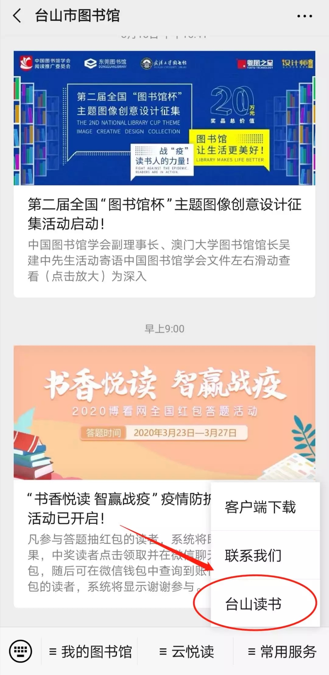 2、点击左下角“常用服务”,选择“台山读书”;