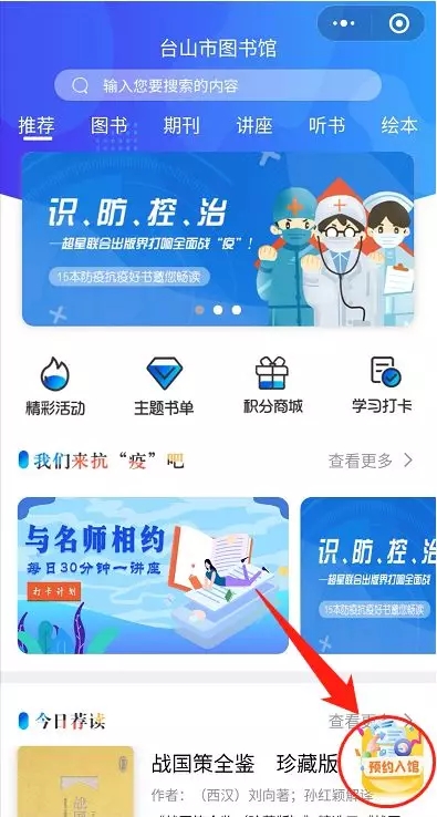 3、在“台山读书”页面的右下角点击“预约入馆”即可填写信息预约入馆。