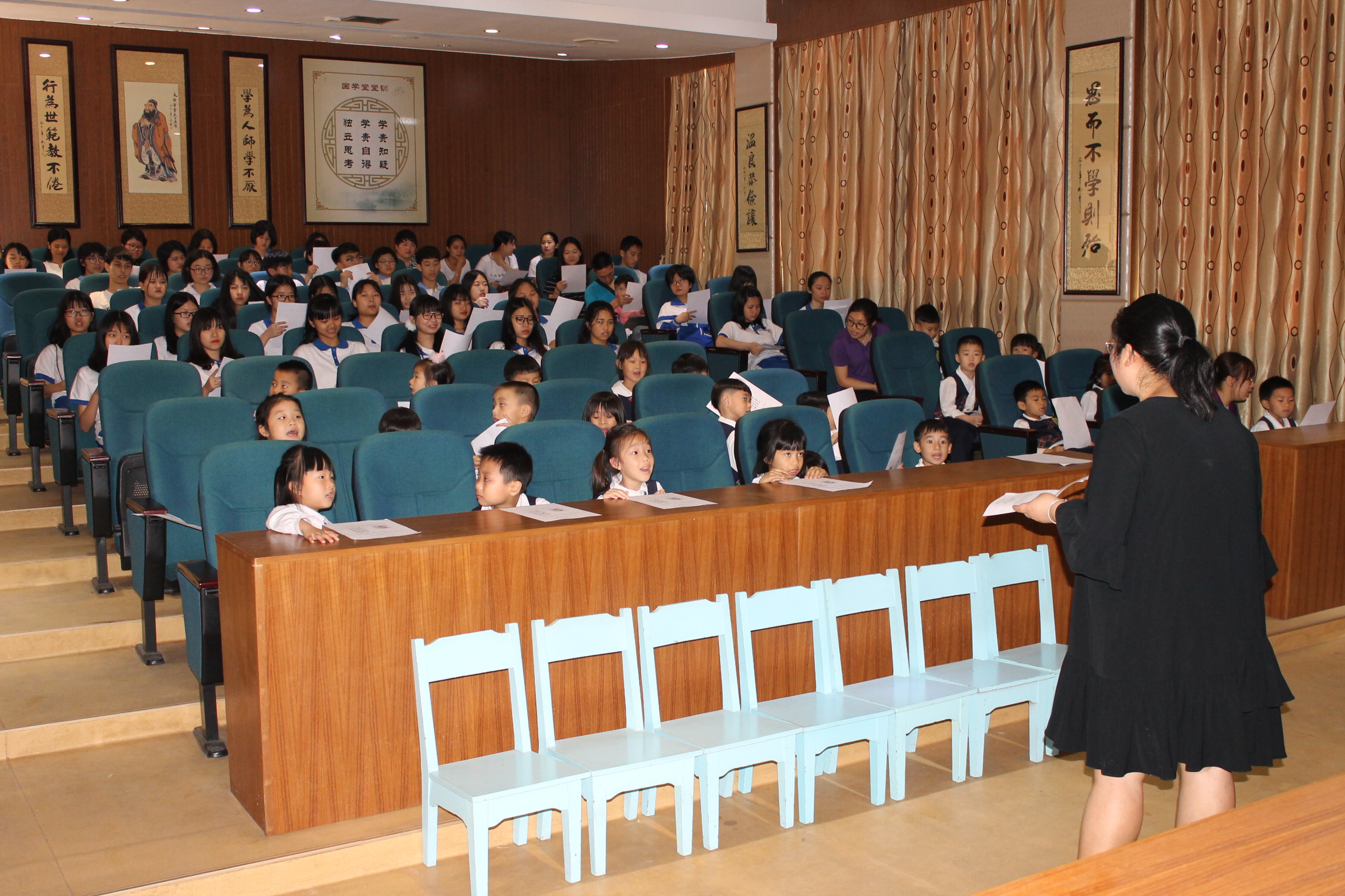 在市图书馆现场,汇聚了台山市技工学校、华侨中学、六福幼儿园等100多名师生参加了本次共读活动,主持人孟老师向学生们推荐了适合各年龄层阅读的经典书目,随后孟老师领诵,师生们一起朗诵了《丑奴儿.书博山道中壁》,琅琅的读书声在报告厅内响起,“少年不识愁滋味,爱上层楼。爱上层楼,为赋新词强说愁。。。。。。”,最后孟老师向学生们介绍诗中的涵义,鼓励大家多阅读、坚持阅读。