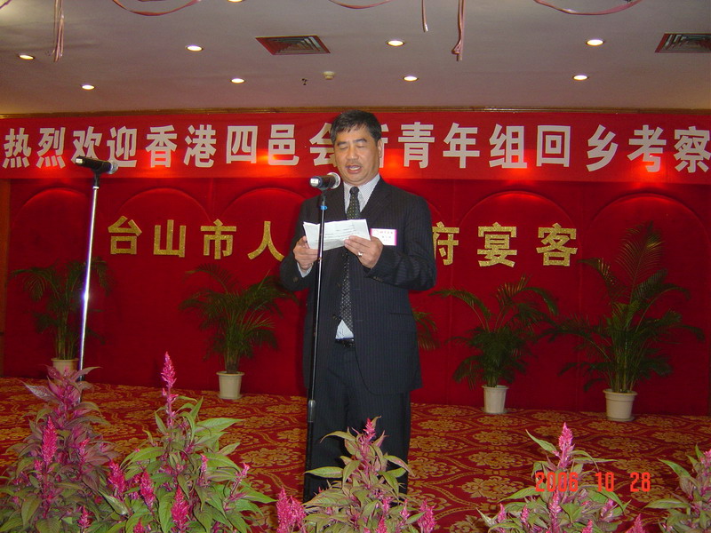 10月27日,应台山市青年联合会的邀请,香港四邑会所青年组访问团一行40多人在理事长陈中伟先生的带领下回乡参观考察。市政协主席黄小玲、市委常委李健慈、黄伟红、市人大副主任邝锦镛、市政府副市长黄淑质,团市委书记马品高等领导在园林酒店接待并宴请了访问团一行。香港四邑会所永远荣誉会长甄兰爱女士和部分青联常委也出席的晚宴。宴会上,副市长黄淑质、团市委书记马品高分别代表市政府和市青联对访问团作讲话表示热烈欢迎,并互赠纪念品。