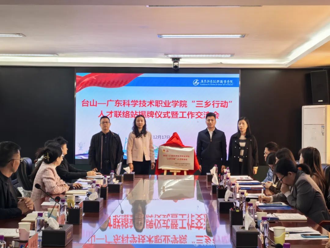 随着黄茅海跨海通道的建成通车,为进一步推动“三乡行动”走深走实,发挥高校青年人才资源优势,深化校地合作和结对共建,为台山市“百千万工程”赋能,12月17日,共青团台山市委员会书记莫柯率队前往广东科学技术职业学院开展台山-广东科学技术职业学院(以下简称“广科院”)“三乡行动”人才联络站揭牌活动。中共台山市委组织部部务委员谭雁清、台山市人社局副局长肖雄英、共青团台山市委员会副书记王元元、镇(街)团(工)委书记代表及市委组织部、市人社局、团市委相关干部参加活动。