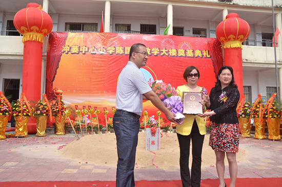奠基典礼在鼓乐齐奏中开始了。副市长黄国忠先生、冲蒌镇人民政府镇长黄吉照分别致辞,高度赞扬了陈彩珍女士热爱家乡教育事业、慷慨捐输兴学育才的高风亮节;金津置业有限公司董事长陈彩珍也作了发言,感人肺腑,兄妹情深令人动容。接着台山市委常委、统战部部长黄淑质、冲蒌镇镇委书记李文斌向陈彩珍女士赠送纪念品。在热烈的掌声、礼炮声中,领导、嘉宾们一起为冲蒌中心小学陈国海教学大楼奠基,预示着冲蒌中心小学必将花开满园,芳香四溢,拥有辉煌的明天。