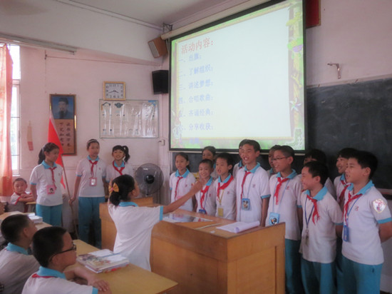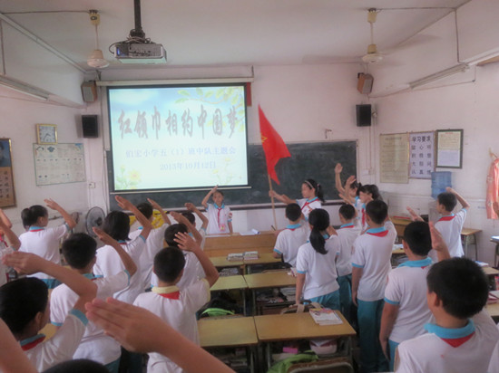 为深入学习贯彻习近平总书记在参加“快乐童年·放飞希望”主题队日活动时重要讲话精神,开展好理想信念教育,增强少先队员对少先队组织的光荣感、归属感,用中国梦激发孩子们心中的理想梦、科学梦、创造梦、报国梦,结合团省委办公室、省少工委办公室关于《关于开展“红领巾相约中国梦”建队纪念日广东省统一主题队日活动的通知》(团粤办联发[2013]7号)的工作要求,伯宏小学抓住这一有利的教育契机,在10月12日上午,五(1)中队组织全班少先队员召开了“红领巾相约中国梦”主题中队会,庆祝中国少年先锋队第64个建队日。