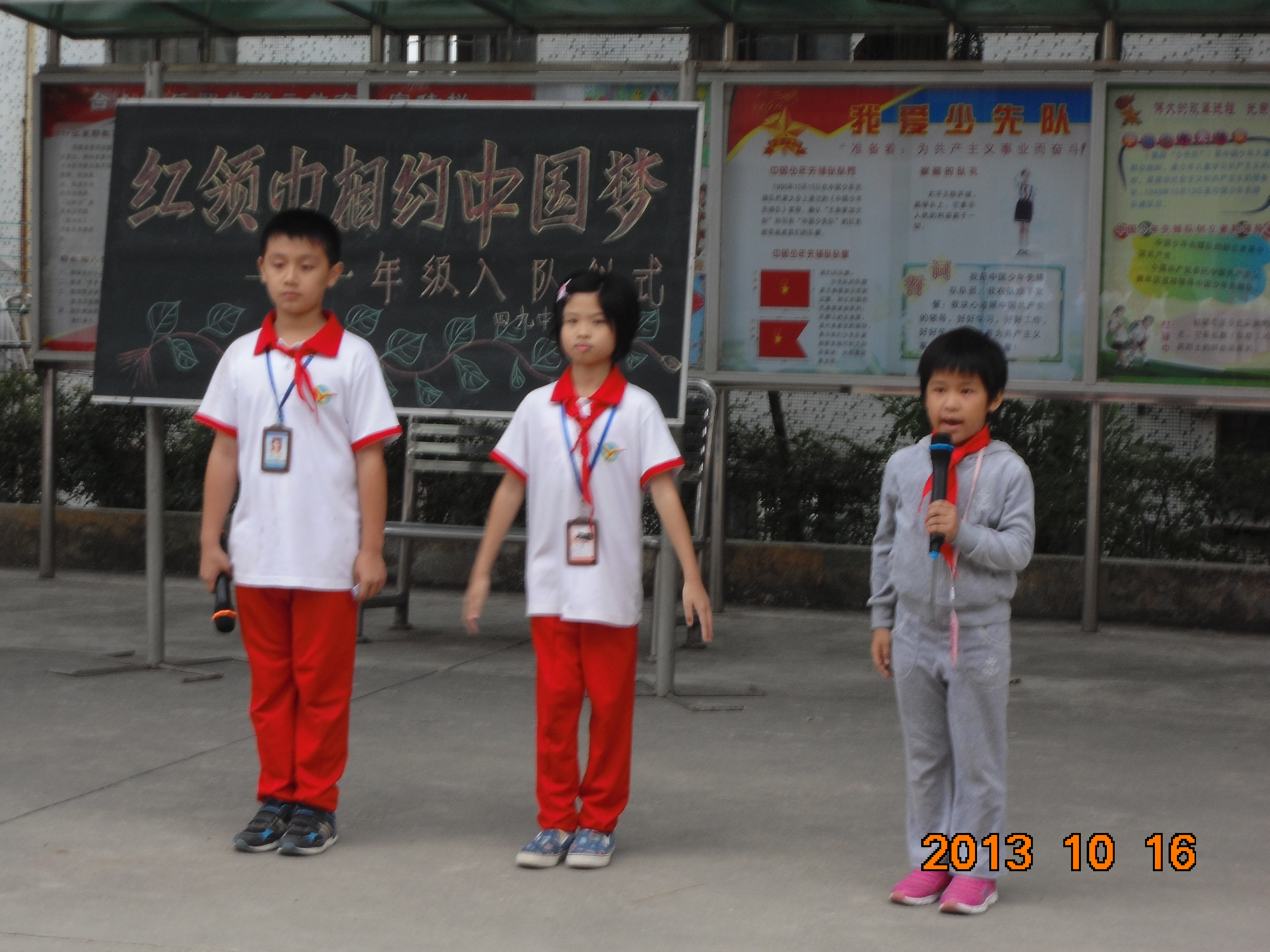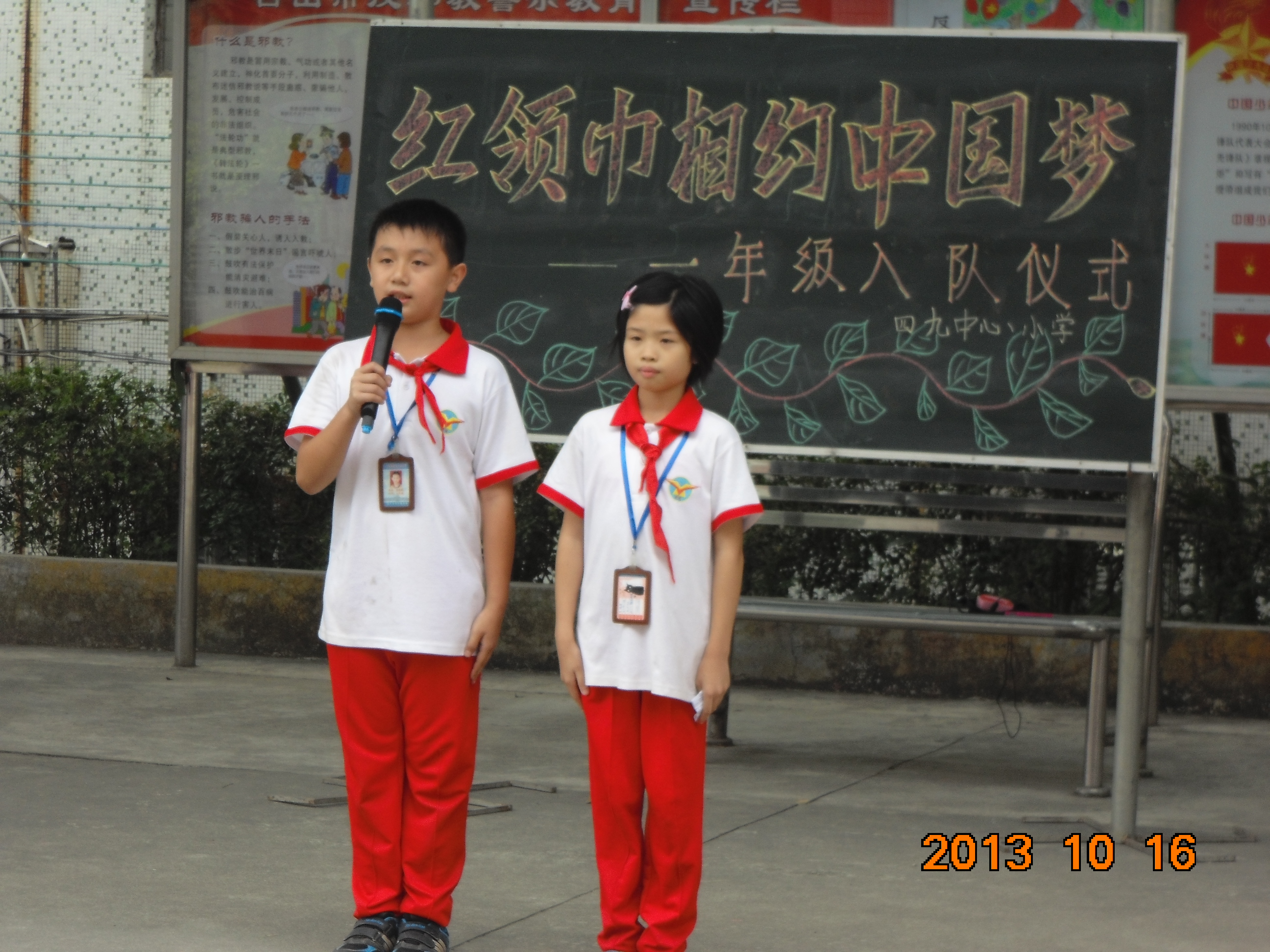 2013年10月16日,四九中心小学举行了“红领巾相约中国梦”一年级入队仪式。学校紧紧抓住这一契机,引导队员们继承和弘扬少先队的光荣传统,增强少先队员的光荣感和自豪感,展示新时期我校少先队员乐观、积极和向上的精神风貌,一年级184学生佩戴上了鲜艳的红领巾,光荣的加入了中国少年先锋队。