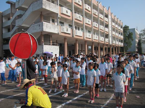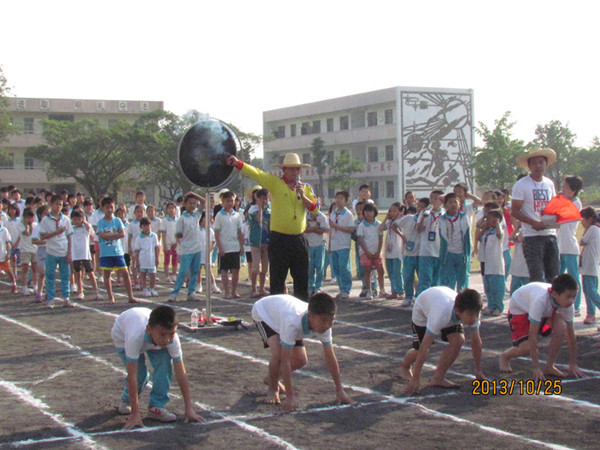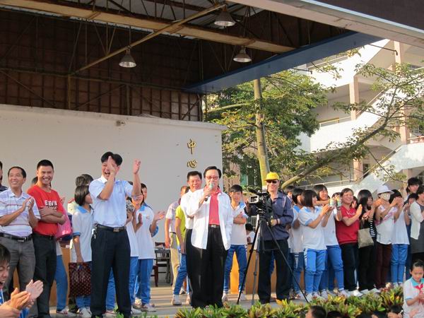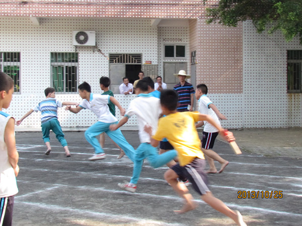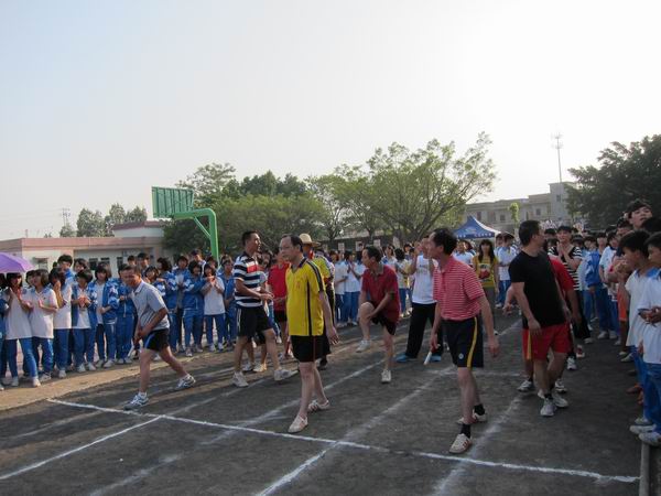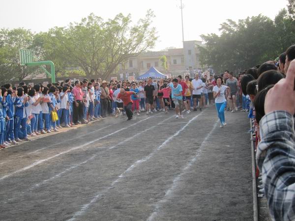 10月25日下午,同学们的比赛结束后,万众期待的最精彩节目是教师接力赛,比赛分小学部和初中部,各三个组,每组由6位男教师与6位女教师组成,12*50米迎面接力跑。同学们看到学校的领导、老师都站在了跑道上,跑道两边水泄不通。比赛到了白热化的时候,连名誉校长梅贤添先生都拿过高音话筒大声鼓劲,校园顿时成了欢乐的海洋。