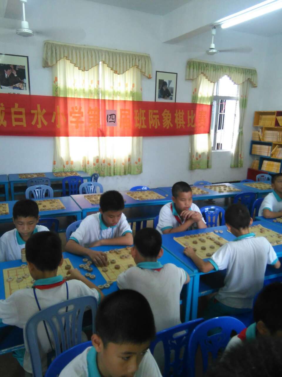 为了弘扬中华优秀传统文化,建设特色学校,增强校园的传统文化氛围,提供给学校象棋爱好者一个发挥自己特长,展示自己棋艺的平台,白水小学于6月2举行了第四届象棋比赛。本次比赛班际赛,参赛选手各显身手,比赛随之展开。所谓”一着不慎满盘皆输”,参赛者都认真贯彻学校倡导的“走好每一步”的棋艺精神,每走一步都认真的思索着,谨慎的移动着自己手中的棋子。全场的气氛温和而又紧张,棋纸上的股股杀气则透露在了整间房子,在场观看的老师、同学们也在旁紧张着,但均“观棋不语”的默默看着。最后在一片欢呼声中,四(1)班、五(4)班、六(3)班取得了班级冠军。最终宣布活动圆满结束。