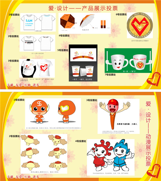 当天,“爱•设计”义工(志愿)文化产品投票现场热烈,市民踊跃地到投票点领票,在义工们的指引下观看完本次设计大赛的所有作品后,为他们喜爱的作品投上珍贵的一票。其中动漫设计4号作品志愿娃娃最受群众欢迎。