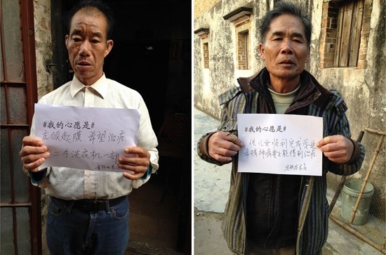 1.左眼起膜,希望能得到治疗;2.希望能有一部二手洗衣机 |