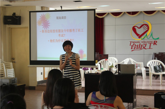 培训一开始,梁健玲就和义工进行互动问答,提高了全场义工对社工这一职业的理解和兴趣,再通过讲述自身社工经历,结合课件和视频给义工分析了社工的过去、现在与未来,讲解社工与义工的区别,如何从一名义工发展成为社工等问题。鼓励义工多学习、多活动,参加社工考试,专业服务社会。
