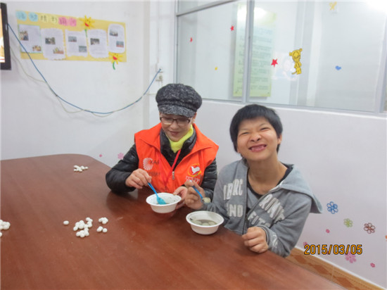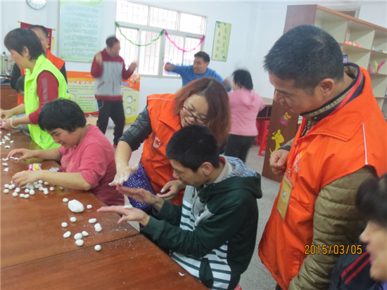 2015年3月5日是全国第52个学雷锋纪念日,也是正月十五元宵节。为了弘扬传统文化和义工文化,给康园中心的学员带来一个不一样的元宵佳节,市义工联组织了10多名义工来到台城街道康园中心,与学员一起搓汤圆,庆元宵。