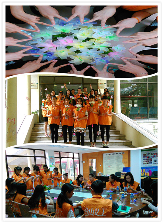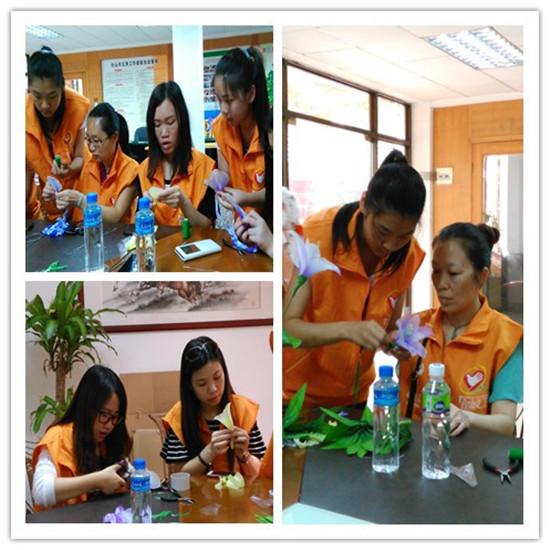 为让义工们更好、更快地学会做丝网花,市义工联联系了联合中专的师生来担任本次手工课的老师。在活动过程中,老师向大家介绍制作丝网花所用到的材料,以及制作的流程,义工们认真地听手工老师讲解,思考怎样才能把花做的更好。在老师耐心的一步一步的教导下,经过两个小时的努力,一朵朵栩栩如生的丝网花在大家手中诞生了, 看着自己亲手制作的丝网花,大家都感到非常的开心和自豪。
