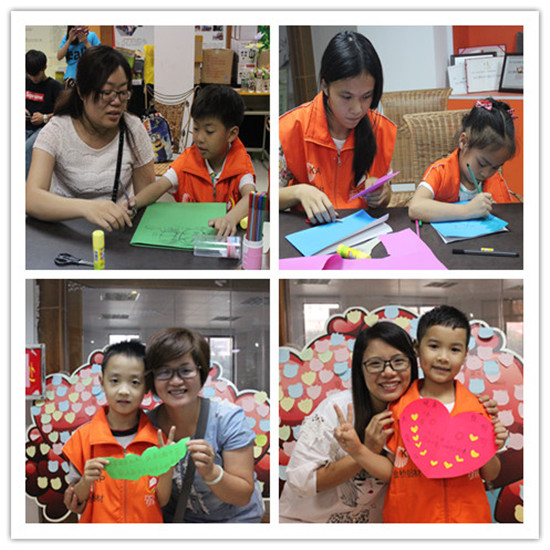 此次活动主要分为三个环节。第一个环节是亲子游戏环节,让家长和孩子一起玩“盲人过马路”的体验游戏,这个游戏是需要孩子和家长的互相合作才能完成的,主要目的是让小朋友与家长在玩游戏同时,可以互相配合,培养亲子间的默契与信任。第二个环节是手工制作环节,义工们将事前准备好的卡纸分发给每位小朋友,让他们DIY一张感恩卡片送给妈妈,小朋友一领到卡纸,就认真地制作起来,努力将心中想对妈妈表达的爱意表达出来。