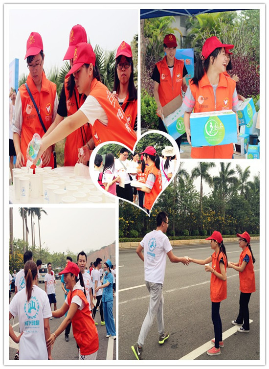 在比赛路线中共设置了13个志愿者服务点。在当天早上8:00所有义工都准时到达自己的工作岗位,并认真做好各项准备工作,先将水杯整齐的摆放在桌子上并倒上矿泉水,还自觉地确定好比赛开始后谁负责递水,谁负责倒水等分工,务求为参赛者们提供更贴心的义工服务。比赛正式开始以后,每个服务站的义工们一看到参赛者们的身影,就马上进入服务状态,认真工作,一直忙到所有的参赛者都跑过服务点为止。