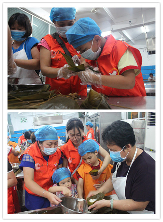 为了按计划顺利包好粽子,厨艺技工学校的工作人员买好了糯米、粽叶、肉等包粽子的材料,并提前一天做好了各项准备工作,在活动正式开始前,糯米、粽叶、肉等必备材料就被整齐地摆上桌。活动正式开始后,大家纷纷在专业老师的指导下开始包粽子,小义工们也在家长的帮忙下,有模有样地包起来,整个活动现场欢声笑语,其乐融融,大家都忙得不亦乐乎。因为有不少大人都不会包粽子,包出的粽子几乎没有相同的形状,有大有小,有肥有瘦,把大家给逗乐了。经过一晚上的努力,大家亲手包好了600多个粽子。