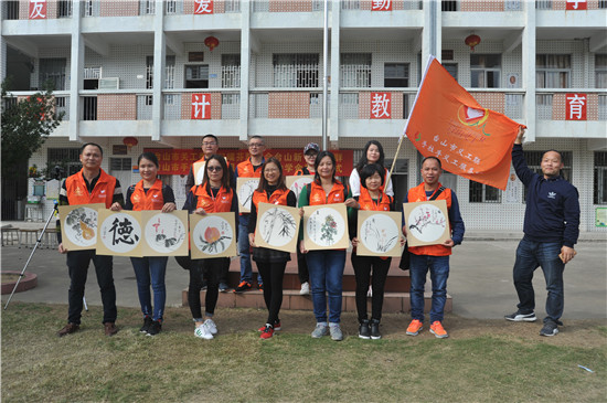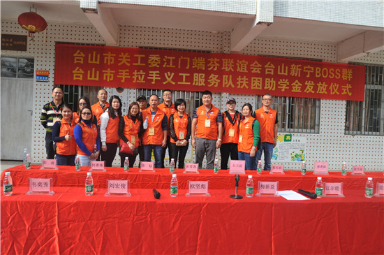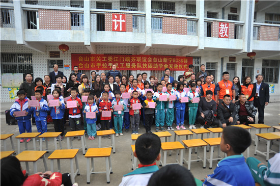 当天下午,手拉手义工服务队联合台山市关工委、江门端芬联谊会、台山新宁BOOS群等一群爱心人士来到端芬镇墩寨小学,举办扶困助学金发放仪式。在仪式上,台山一位书画家为学校捐赠了十幅字画,并表示要墩寨小学成立一间书画室供同学们学习。不仅如此,该校的30名贫困学子每人还得到了由社会爱心人士捐赠的1000元爱心助学金。