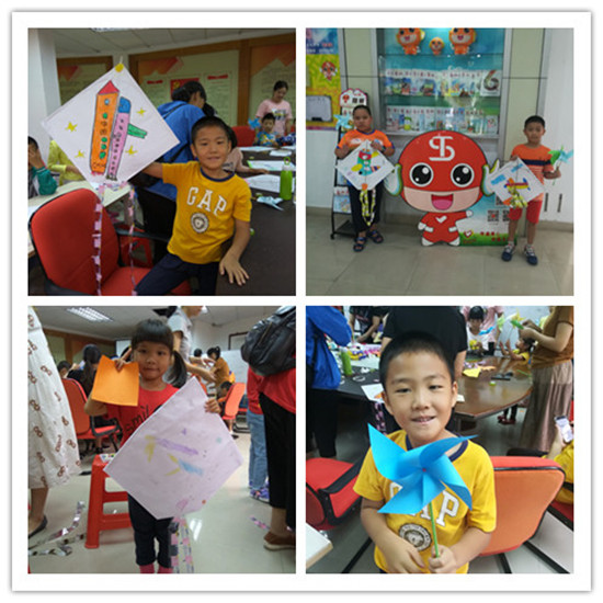 活动开始后,义工先把用来制作风筝的纸张和彩笔放给每一位小朋友,让小朋友按照自己的想象去画自己理想中的风筝图案,小朋友们在家长的陪伴下,纷纷画起自己喜欢的图案。当孩子们画好图案后,义工拿出准备好的竹条,让孩子跟家长一组,开始了风筝的制作。孩子们在老师的指导下,按照制作步骤,先把制作风筝的竹条固定好,再将画好的图纸粘贴好。在制作的过程中,小朋友们互相交流,纷纷制作出自己心目中美丽的风筝。风筝制作好后,义工还教孩子们制作风车,在家长的协助下,一支支彩色风车就在小朋友们的手中做出来了。当风筝和风车制作完成时,孩子和家长都露出了开心的笑脸。