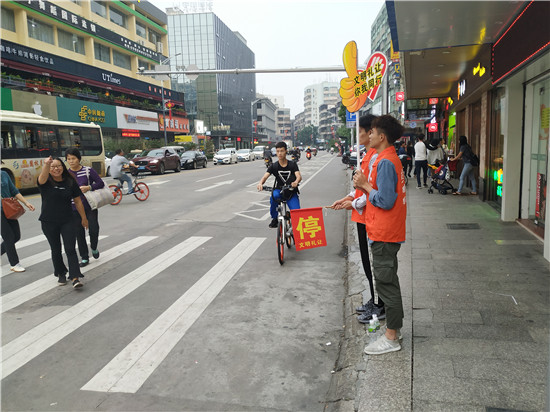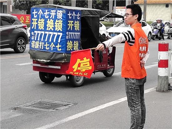 4月17日,团市委、义工联组织志愿者在南塘社区商业城路口开展文明交通劝导活动。