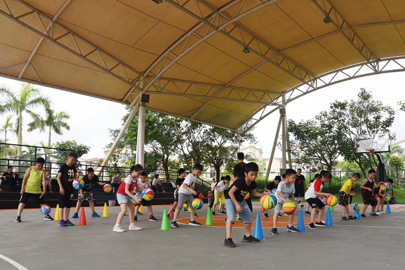 6月2日上午,由团市委联合教育局主办,篮球协会、杰出文体协办的一堂新时代文明实践活动——七彩篮球课在台山碧桂园天幕篮球运动中心开课了。该课堂完全免费,安排了定点控球、弓步控球、左右手控球、定点配合控球、绕桩控球、跑步定点控球、敏捷步锻炼,以及家长同乐等8个项目。课堂上,首先由教练带领大家进行热身运动,并讲解篮球的基本常识,随后,教练使用标志桶、雪糕桶、八角环、敏捷梯步、绕桩柱等专业篮球培训器材进行技术动作演示,同时细致讲解动作要领,课程从基本技巧慢慢引向难度深入。学生们被课堂内容深深吸引,在教练的指导下学习篮球基础知识和技术,虽然大汗淋漓,但是积极坚持,刻苦学习,纷纷完成了各项“任务”,愉快地体验了一把篮球的魅力。