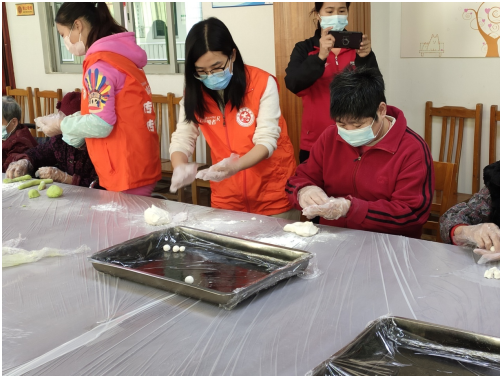 志愿者和公公婆婆一起制作汤圆,大家边聊天边忙活,现场气氛既热闹又温馨,不一会儿,一个个圆滚滚,颜色多样的汤圆,就摆满了案头。在煮汤圆的过程中志愿者们还和公公婆婆们一起唱歌、玩游戏,乐得公公婆婆笑开怀。待汤圆煮好后,志愿者将热腾腾的汤圆送给公公婆婆品尝,汤圆有甜、咸两种,公公婆婆可自己选择喜欢的口味,吃着美味的汤圆,他们脸上笑开了花,举起拇指为志愿者们点赞。