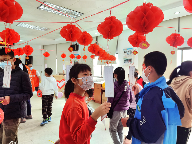 在猜灯谜环节,志愿者在红色的纸上写好灯谜,并把它张贴在灯笼上。高高挂着多彩灯谜迎接博学多才的小朋友,活动现场挤满了跃跃欲试的孩子。