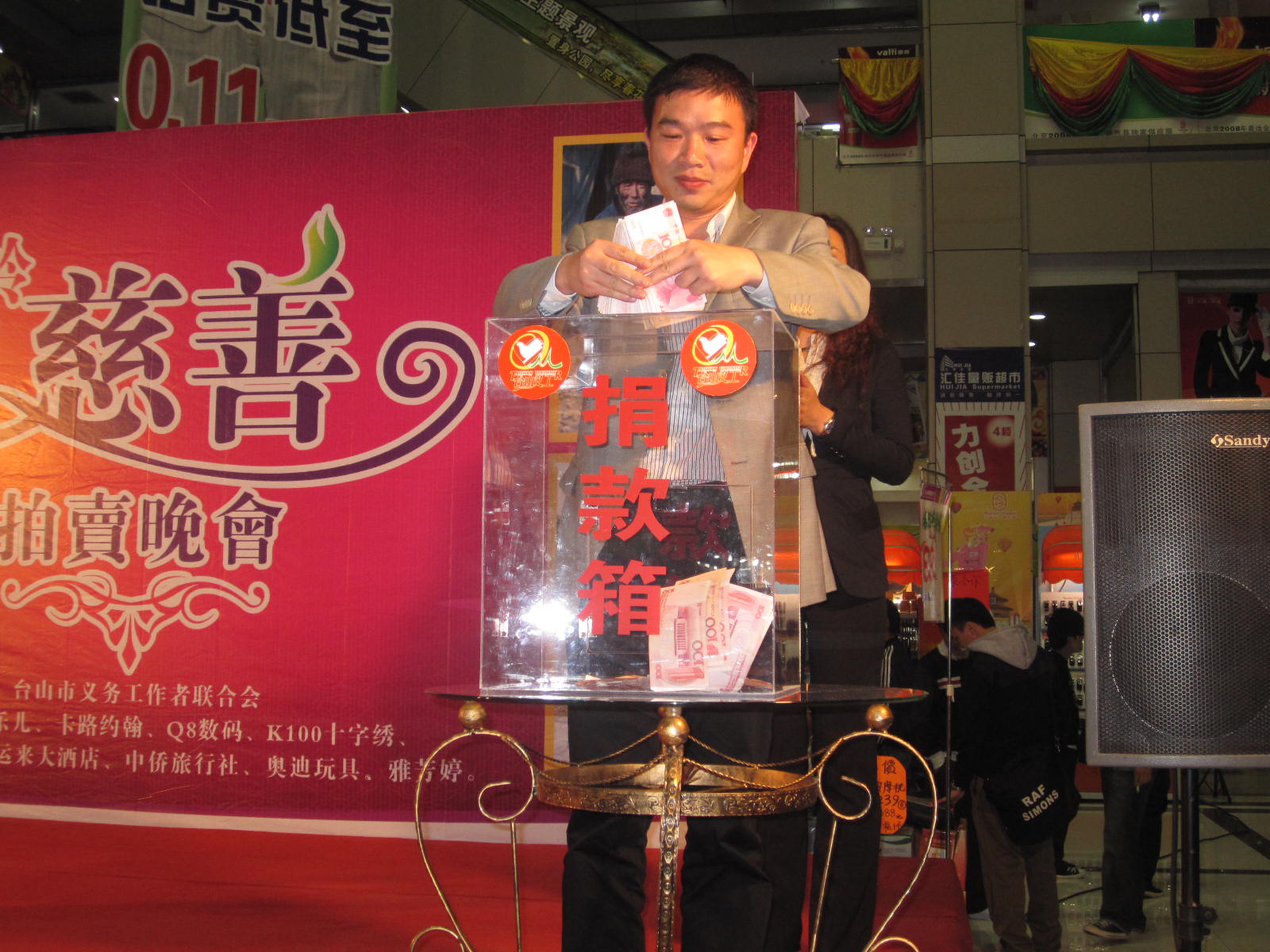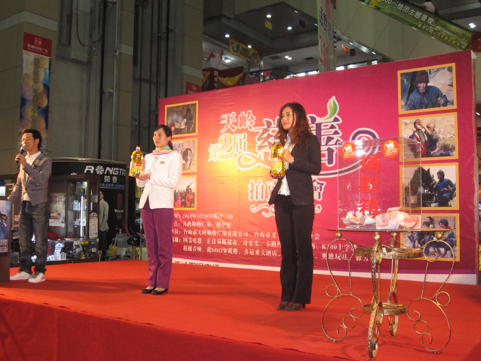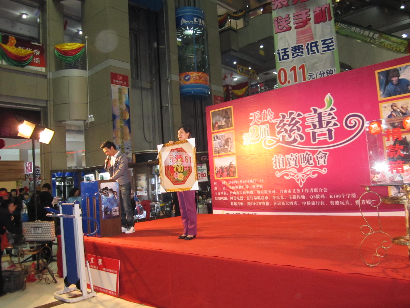 1月19号晚上,市义工联和台山天岭购物广场有限公司联合举办慈善拍卖会,拍卖活动于当晚8时在天岭购物广场中庭进行,市人民政府副市长、市义工联名誉主席黄淑质、团市委书记李国超、天岭房地产开发有限公司、天岭购物广场有限公司董事长陈国强等领导和嘉宾出席了本次拍卖活动。活动还邀请了台山公证处的公证员作了现场公证。