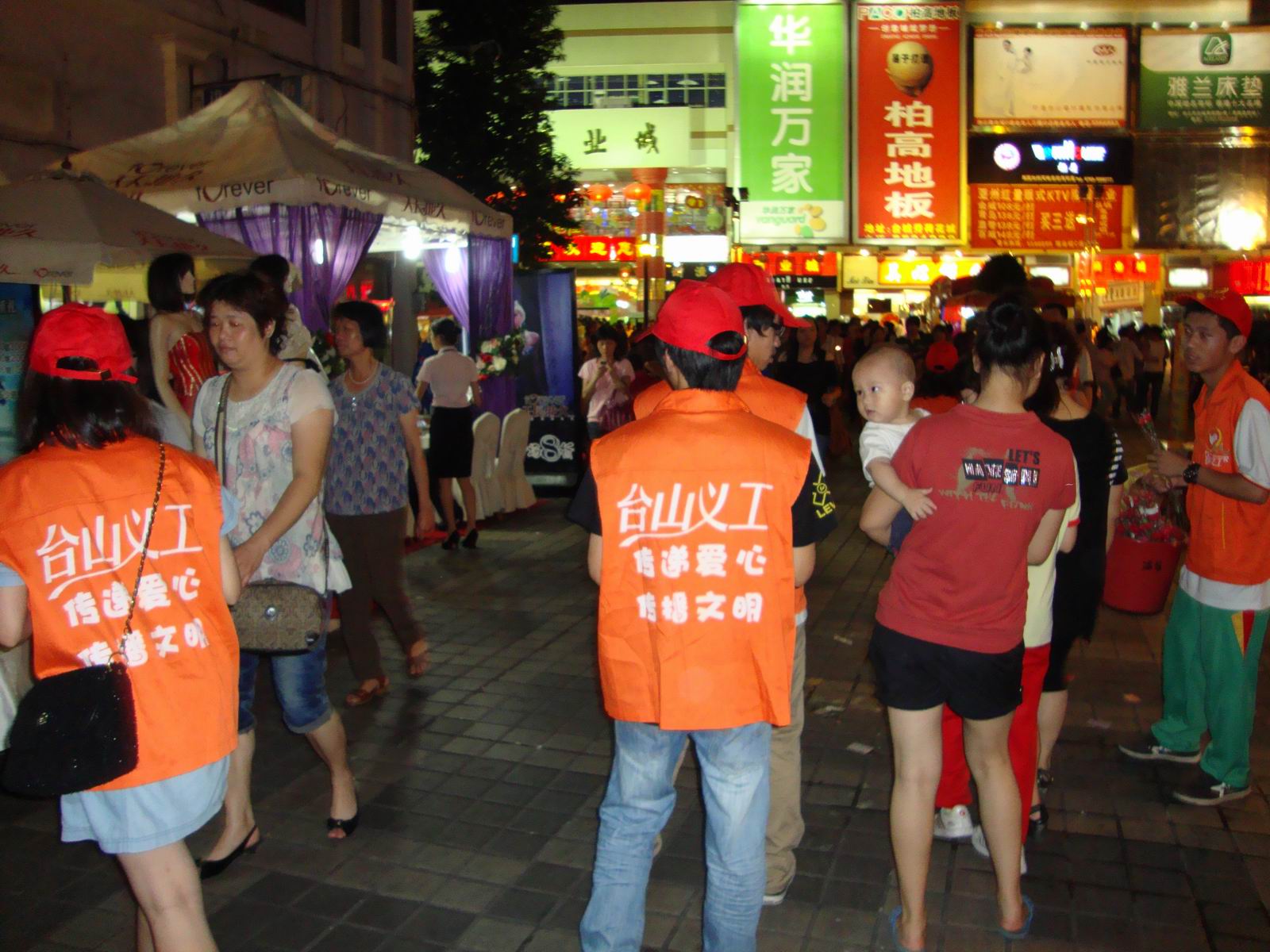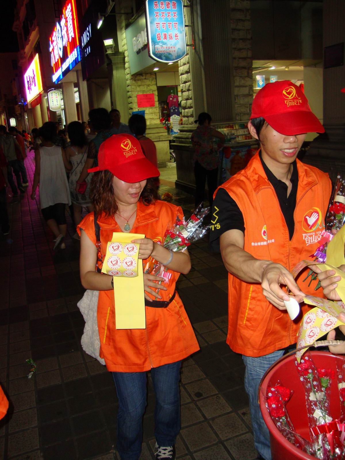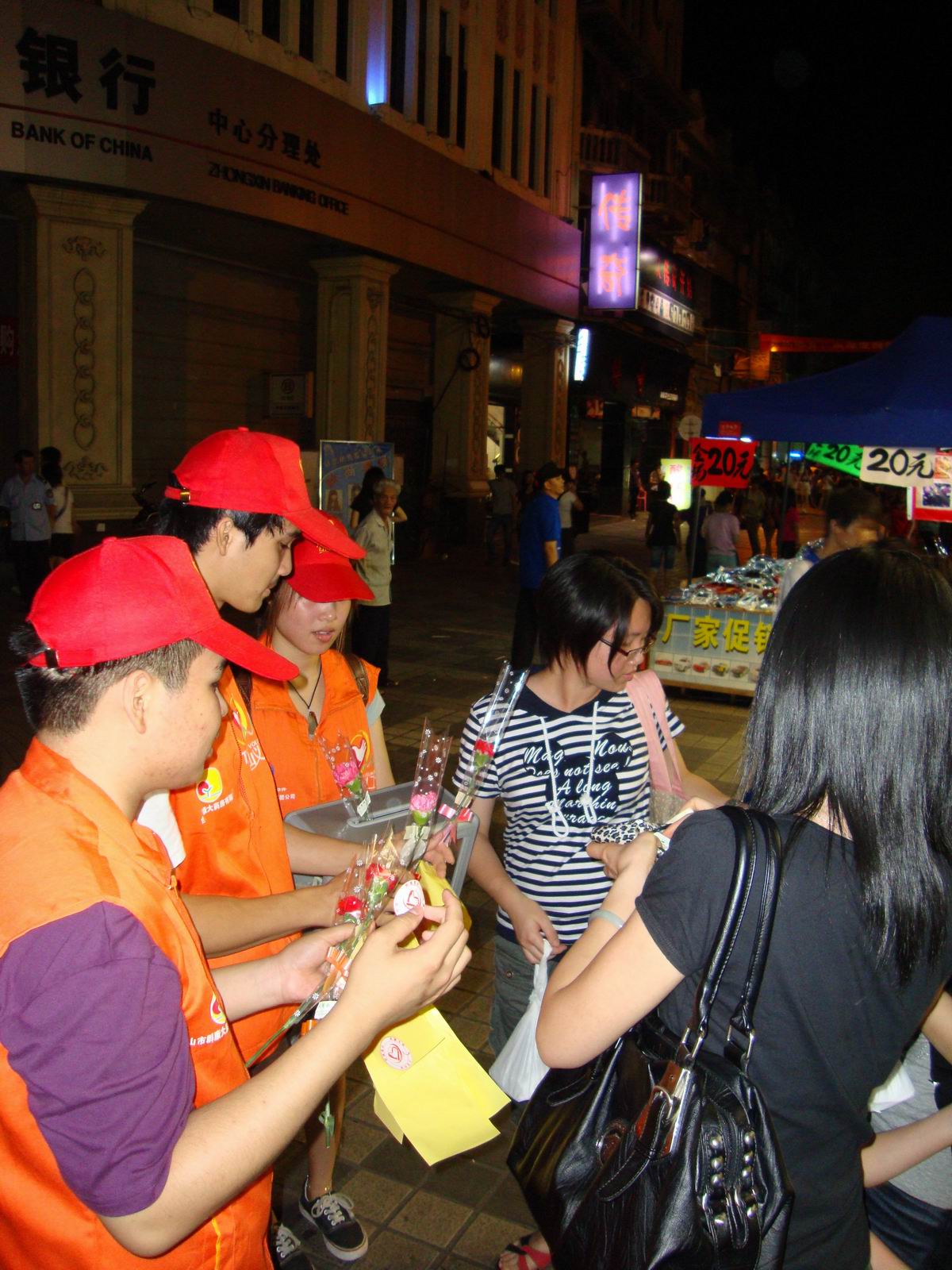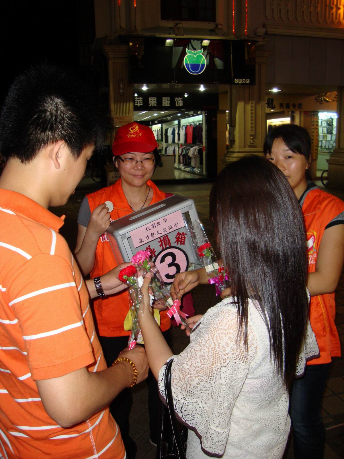 母亲节的前夕,台城商业街区的行人比平时增多,很多市民都选择了陪母亲出来逛街,感受节日的气氛。走在台城的几个繁华地带——天桥路口、步行街、商业城广场,一个个橙色的义工身影在熙熙攘攘的行人里分外耀眼,他们或手捧鲜花、或手捧募捐箱、或手拿义工小标贴,正在为开展康乃磬义卖活动而忙碌着。