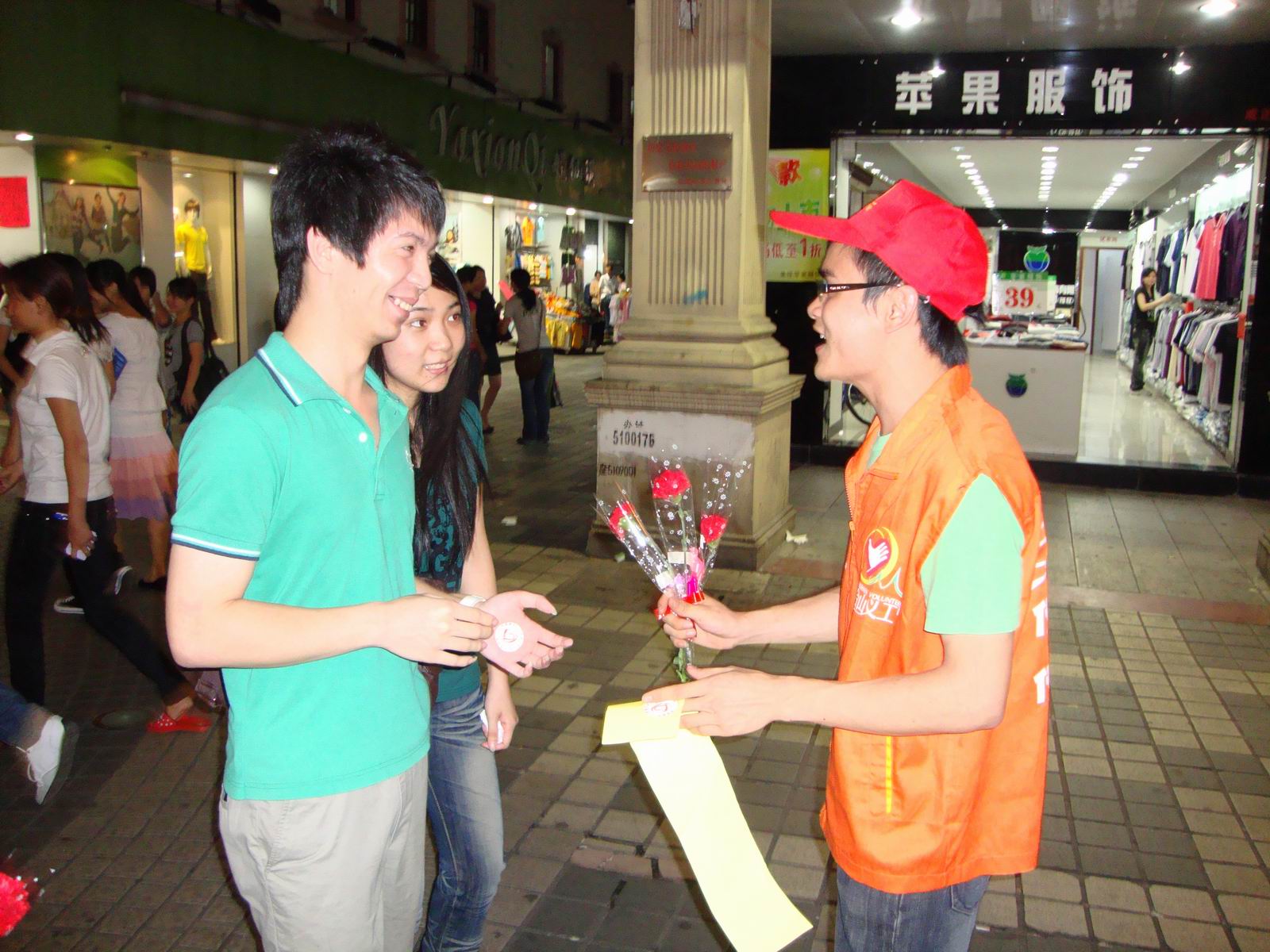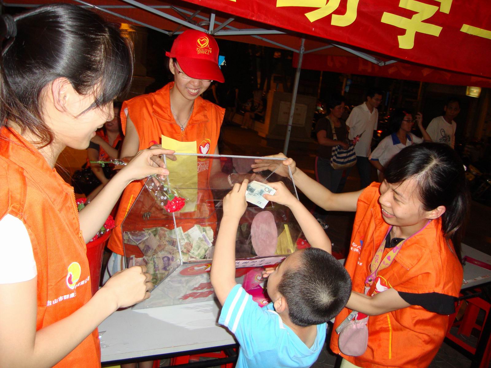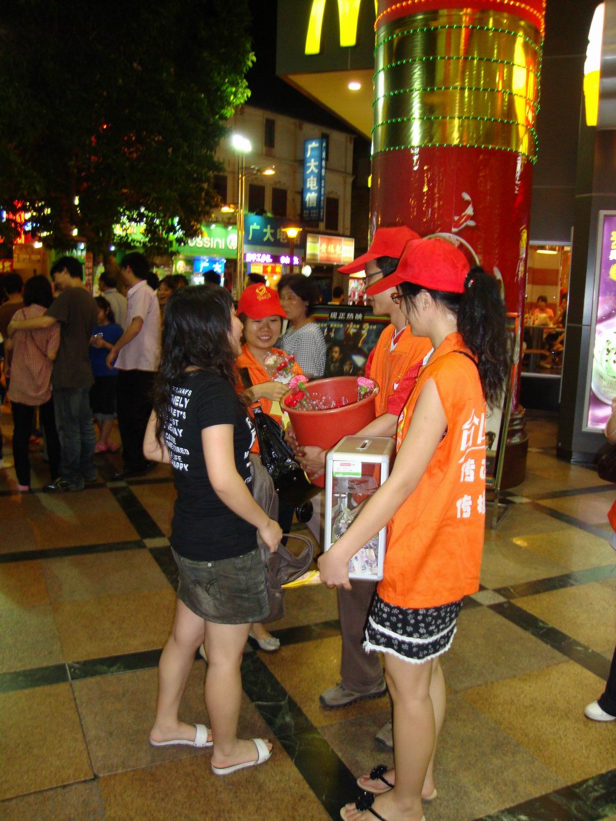 母亲节的前夕,台城商业街区的行人比平时增多,很多市民都选择了陪母亲出来逛街,感受节日的气氛。走在台城的几个繁华地带——天桥路口、步行街、商业城广场,一个个橙色的义工身影在熙熙攘攘的行人里分外耀眼,他们或手捧鲜花、或手捧募捐箱、或手拿义工小标贴,正在为开展康乃磬义卖活动而忙碌着。