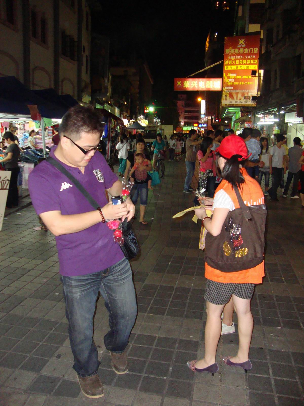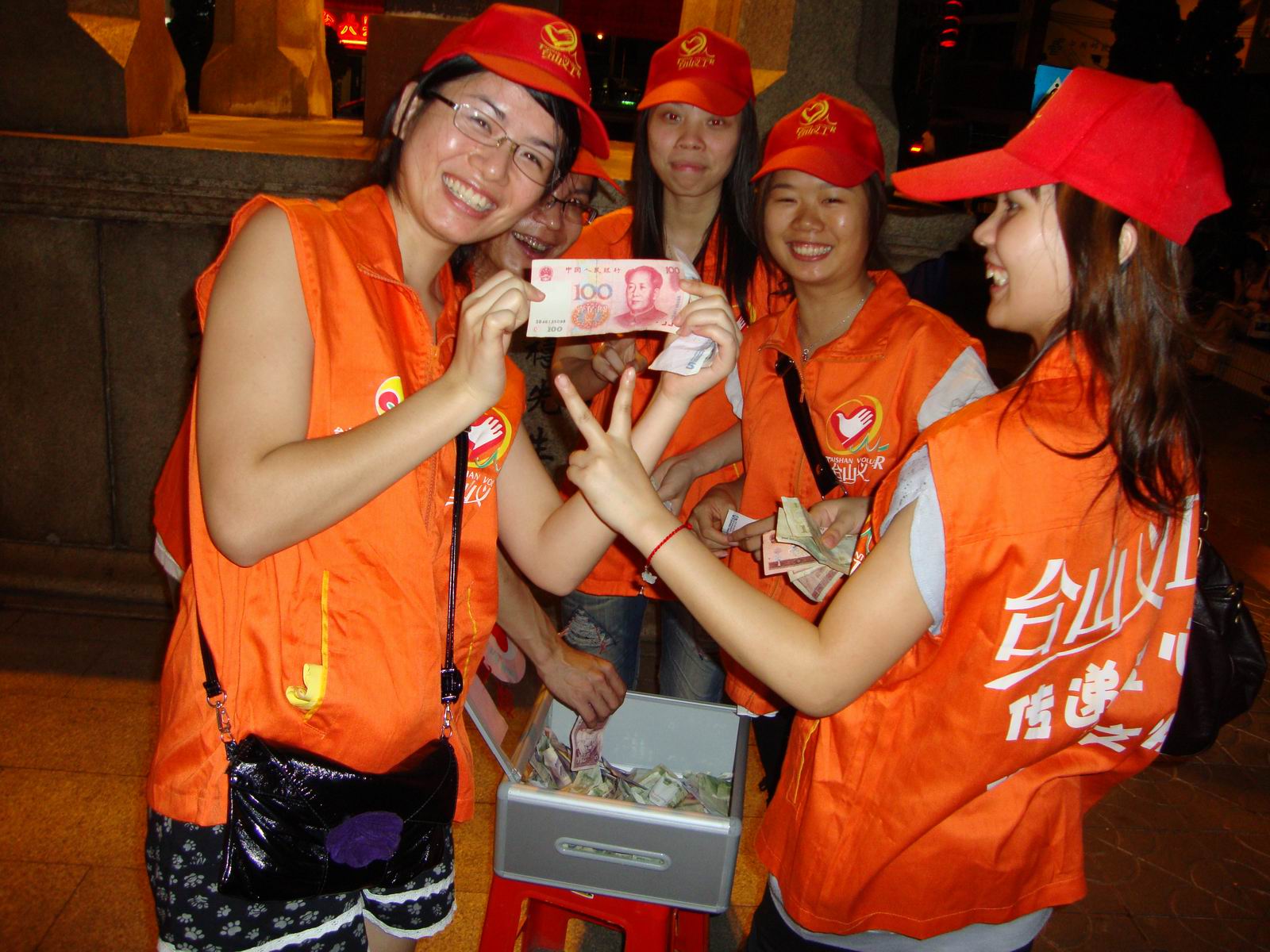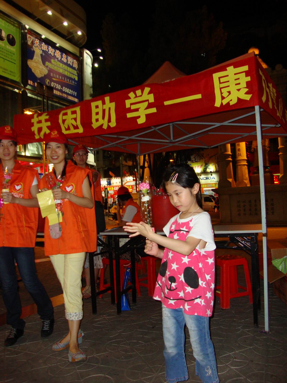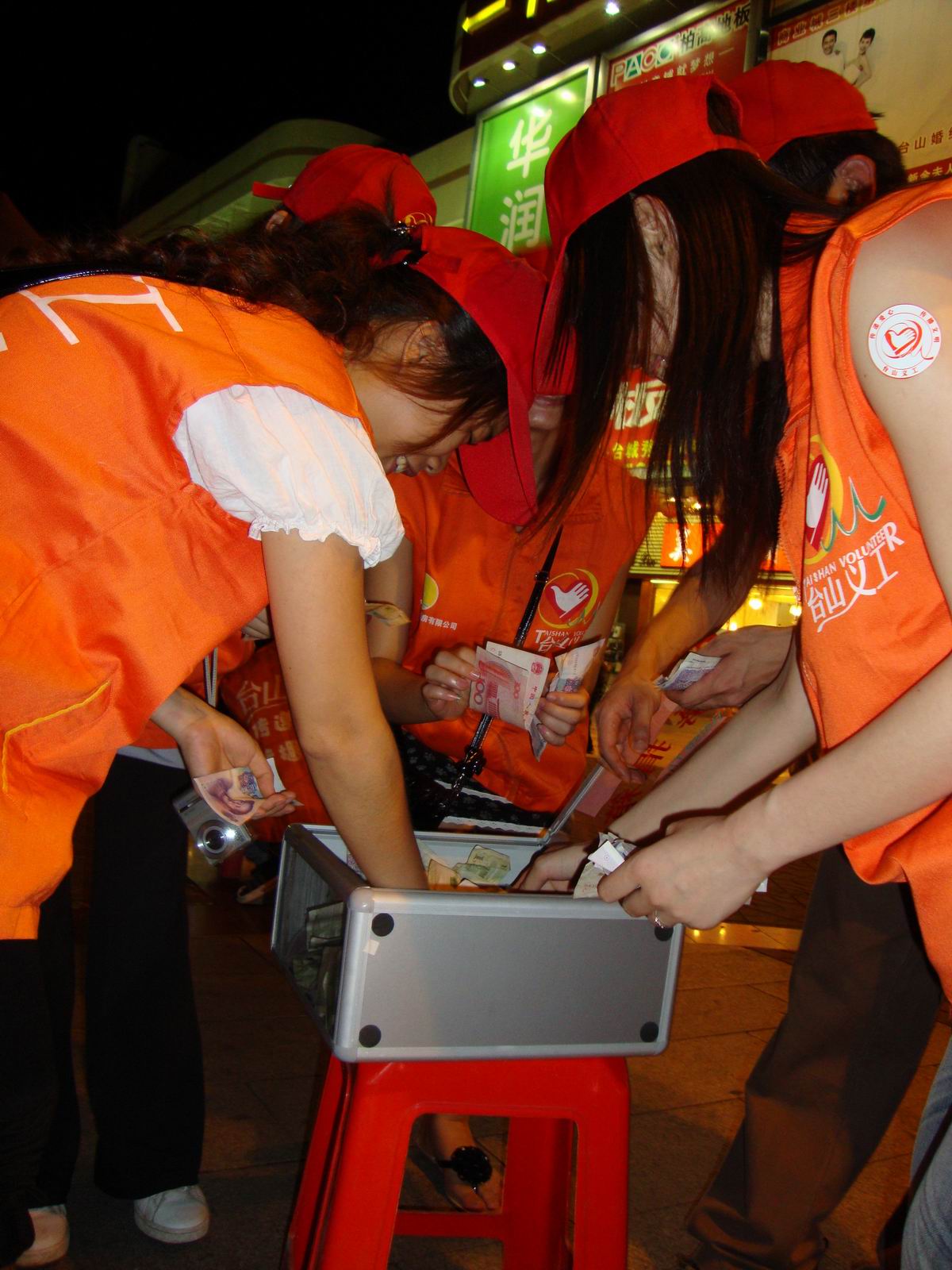 母亲节的前夕,台城商业街区的行人比平时增多,很多市民都选择了陪母亲出来逛街,感受节日的气氛。走在台城的几个繁华地带——天桥路口、步行街、商业城广场,一个个橙色的义工身影在熙熙攘攘的行人里分外耀眼,他们或手捧鲜花、或手捧募捐箱、或手拿义工小标贴,正在为开展康乃磬义卖活动而忙碌着。