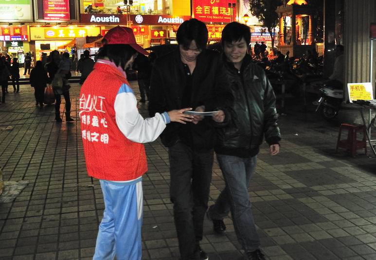 为大力开展禁毒宣传和毒品预防工作,营造“依法禁毒,构建和谐”的浓烈氛围,推动禁毒工作的社会化,形成全民禁毒的良好局面,2月21号晚上,市禁毒办联合市义工联在台山商业城开展“禁毒流动课堂”活动。台山市侨中义工服务队组织了10名学生义工参与本次的宣传工作。义工们主要通过派发宣传资料等手段进行宣传,让更多的市民了解到吸毒的危害。