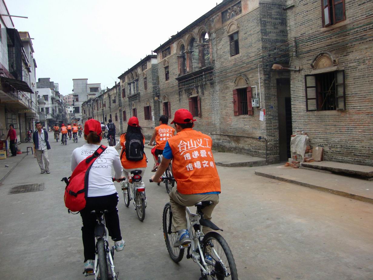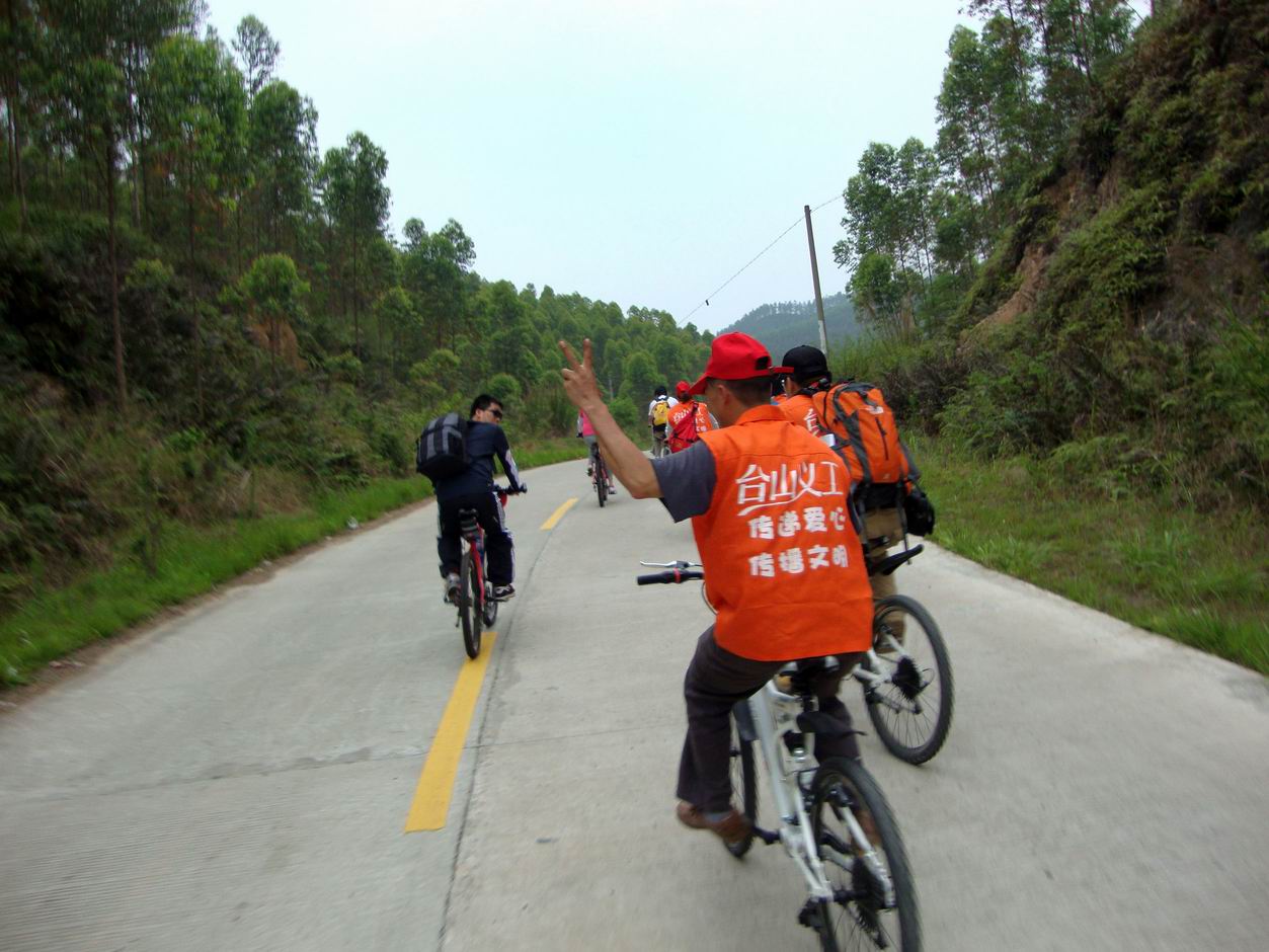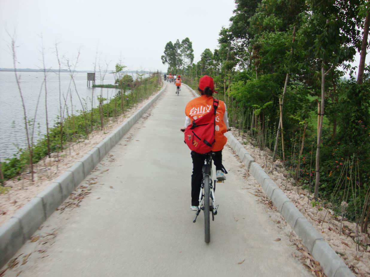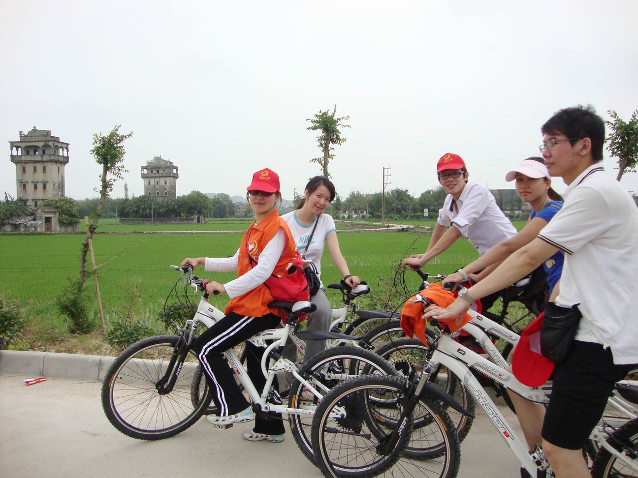 活动当天天气状况相当理想,不但没下雨,更没出现暴晒的情况,这大大提高了绿道骑行的兴致。因本次骑行活动所需的自行车除了有一部分是义工自备以外,其他的自行车全都是由移动公司提供,所以出发地点就选在了城北移动营业厅的停车场,队伍沿着黄道益大道一直向水步冈宁影视城进发,沿途别具侨乡特色的古村落和田园风光从道路两旁掠过,风景美不胜收。在冈宁影视城的“鹅城”门前,义工们拉开了印有“绿道骑行共畅享,低碳生活同给力”字样的宣传横幅进行低碳环保活动的宣传。回程途中,义工们参观了位于潭江边的关帝庙、斜碉楼、古码头等景点。活动来回行程共约50公里。