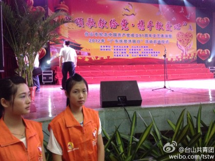 6月29日下午,市义工联组织了近30名义工参加了在台山影剧院隆重举行“颂歌献给党 携手献爱心”——台山市纪念中国共产党成立91周年文艺表演暨2012年“广东扶贫济困日”活动启动仪式。