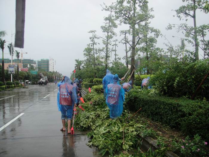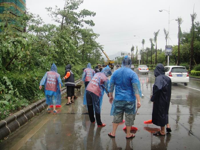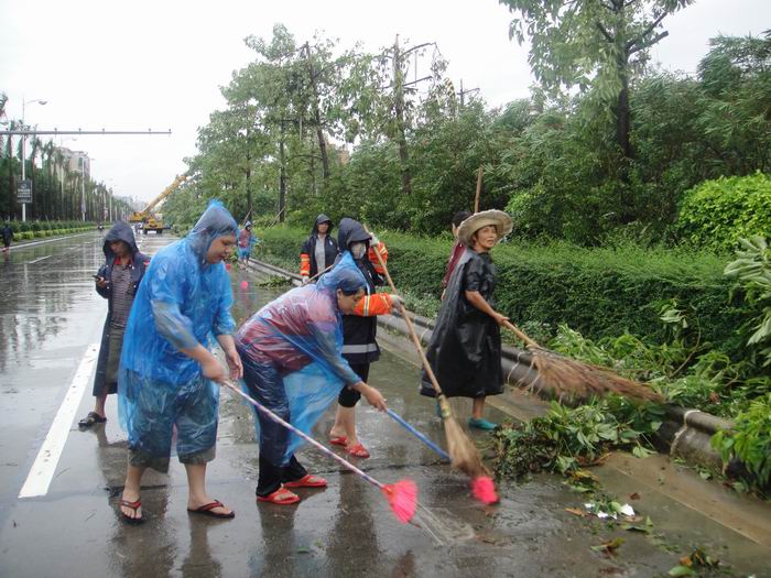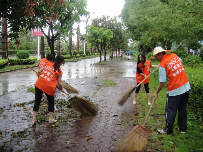 当天下午,台风后的雨天还不断持续,可义工们不惧怕风雨,带上雨具,拿起扫把,就马上投入紧张的劳动去,他们协助环卫工人,一起进行街道大清理。义工们认真地清扫道路上的树叶和杂物,捡起掉落的树枝,经过两个多小时的清洁,侨光大道一带灾后环境得到了大大的改善。
