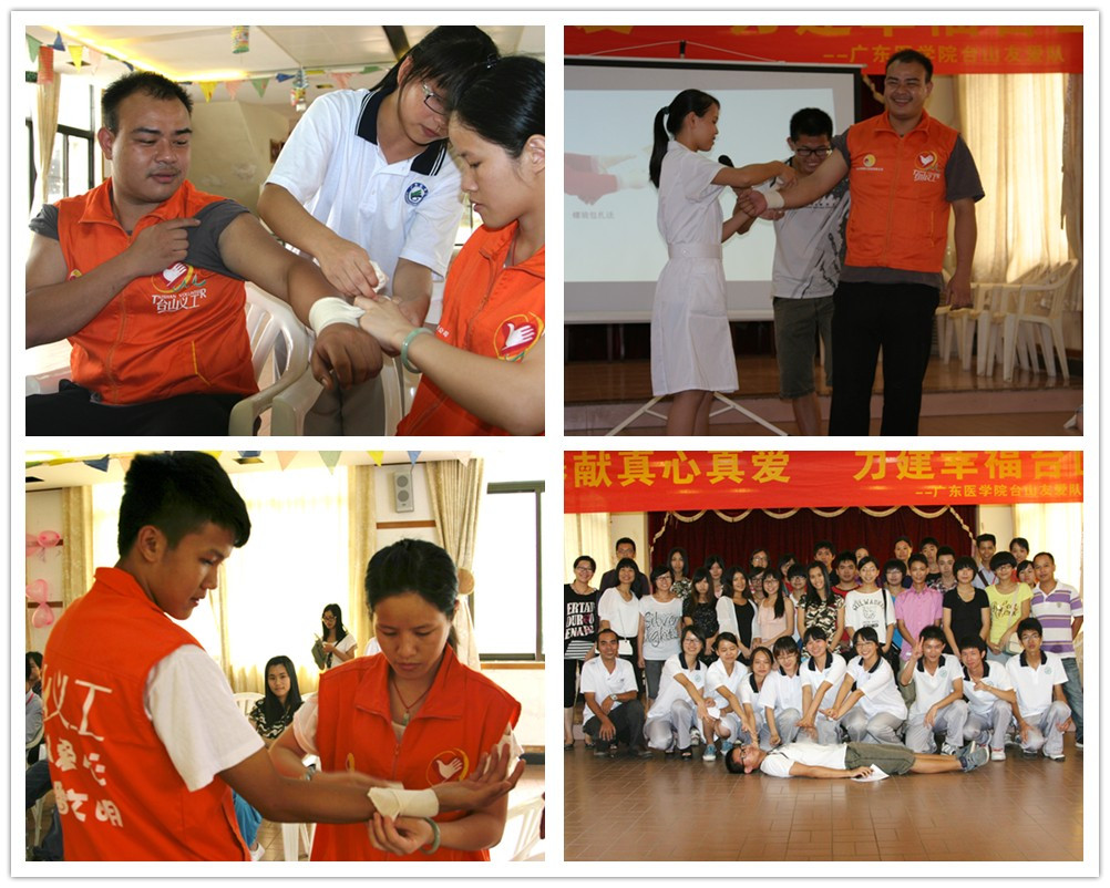 这次培训由广东医学院的学生主持和讲解示范,他们给义工们介绍了应急止血动脉,同时也示范了几种止血包扎法,最重要的还教授大家人体复苏(心外压和人工呼吸)的具体顺序和操作。最后由义工们对模型进行人体复苏练习,大家积极参与,从模拟实践中加强义工的急救知识。