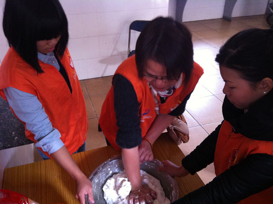 下午2点,晴天义工服务队20多名义工带齐材料到四九敬老院探访,并亲手做起汤圆给老人家吃。义工们分工合作,搓面粉、洗锅子、煮汤丸,忙得不亦乐乎。汤丸煮熟后,几位义工将汤丸送到行动不便的老人家的屋子里,与他们一起吃汤丸,其余的义工和老人家们围着桌子一起吃汤丸,他们有说有笑,场面非常温馨。