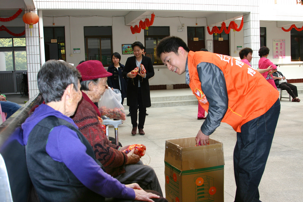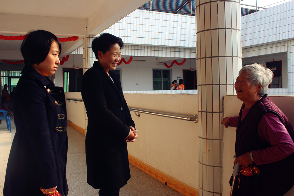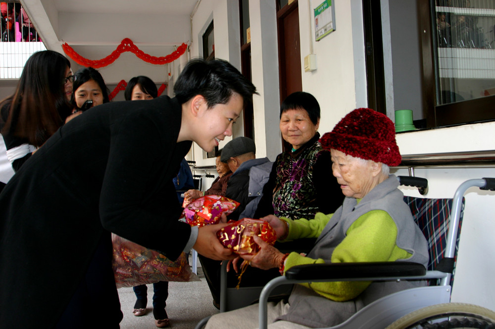 来到敬老院,团市委书记柯嘉妮先了解了台城敬老院的情况,随后带领团市委机关全体干部和义工们亲手将200多个福袋送到每个老人家手上,每到一个房间,柯嘉妮书记和义工们都亲切地询问老人家的生活情况,了解他们是否吃得饱、穿得暖,生活过得是否开心,并送去最真挚的祝福,祝福他们2014年新年快乐,身体健康。