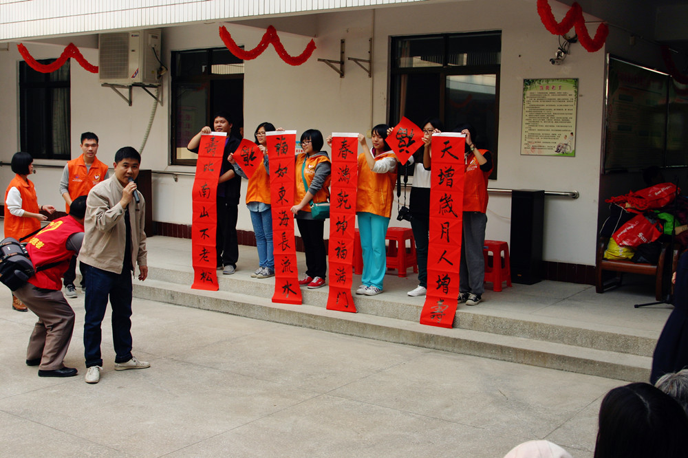 本次活动节目丰富精彩,台山曲艺社为老人家们演唱了《台山市个好地方》、台山市书法协会现场书写了两对挥春,祝福老人家们“福如东海长流水,寿比南山不老松”、自由健身队表演了舞蹈《欢天喜地奔小康》等,老人家们看得非常开心,频频“点赞”。义工们也分散坐到老人家中,与他们一起唠家常、说心里话,说新年愿望,现场气氛温馨、和谐。