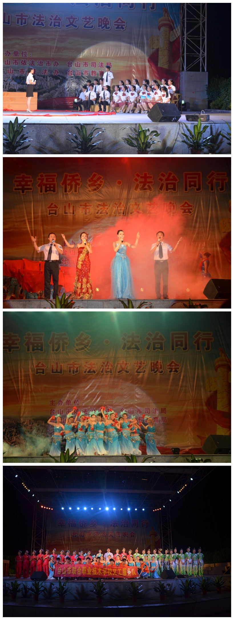 为了顺应创建“法治台山”的要求、全面落实“六五”普法规划、加强对辖区群众的法制宣传教育及法治文化建设,台山市联合职业技术学校义工服务队协助市依法治市办、市司法局、市普法办和市教育局共同举办以“幸福侨乡 法治同行”为主题的法治文艺晚会,晚会以国际6.26禁毒日为契机,大力宣传宪法和法律,弘扬法治精神,让更多的群众掌握法律,加强政府与群众之间的沟通、合作与交流,与时俱进,共同促进台山市创建法治市工作的扎实高效开展。