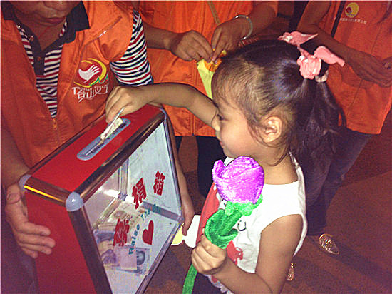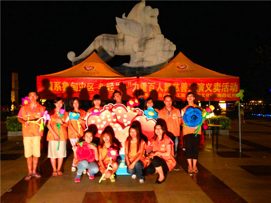 8月17日晚,由团市委和台山市流行舞协会联合举办的“情系鲁甸灾区 年轻 ‘心’力量百人舞”慈善义演义卖活动在石化文化广场举行。当晚市义工联组织了10多名义工在现场协助义卖活动,为云南鲁甸地震灾区筹款。活动共吸引千名市民参与。