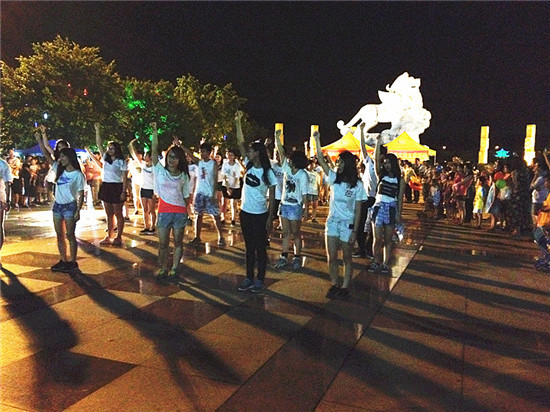 到了晚上8点,广场中心响起一阵音乐声,一群身穿白色T恤的青少年在广场中央,伴随着音乐跳起充满着青春活力的流行舞。这样的表演形式既新颖又吸引眼球,一开场立马就吸引了大量的观众围观。这是由团市委成功孵化的青年社会组织之一——台山市流行舞协会组织承办的,以“年轻心力量”为主题的慈善舞蹈义演筹款活动,旨在呼吁更多的市民关注地震灾区,关爱处于困境的同胞,以舞蹈传达爱心。