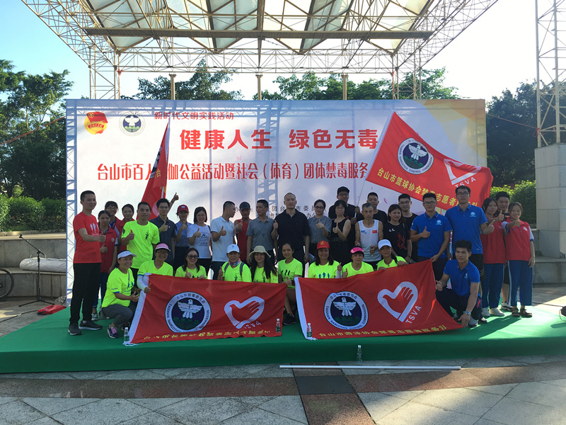 台山市瑜伽协会、篮球协会、足球协会、长跑协会和游泳协会禁毒志愿服务队的队长,从市禁毒委办公室常务副主任、市公安局副局长张雷同志手中接过队旗,并表示未来将充分发挥志愿者在禁毒预防宣传教育等方面的作用,以“体育竞技+禁毒宣传”的模式,向市民传递“健康人生 绿色无毒”的生活理念。活动现场瑜伽协会组织了近百名瑜伽爱好者进行瑜伽公益活动,呼吁更多有社会责任感、热心禁毒工作的市民加入到禁毒志愿者行列。