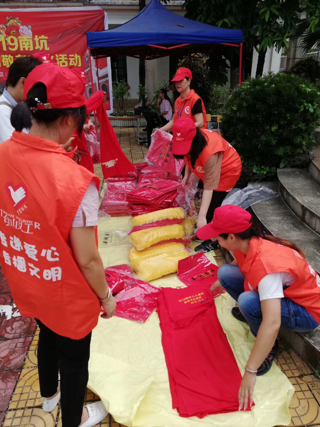 活动当天,天下着蒙蒙细雨,但志愿者们依然热情高涨,两两一组。一组志愿者负责环境整治,他们一手拿扫把,一手拿垃圾铲把活动现场打扫得干干净净,为老人们打造一个干净、整洁、舒适的活动环境;一组志愿者为活动整理物资,一件件红马甲、一条条红围巾被折叠得整整齐齐,有序地送到老人的手上;一组志愿者负责活动现场的指引工作,协助老人、嘉宾进场及就坐,老人们对志愿者的热情服务纷纷竖起大拇指点赞。