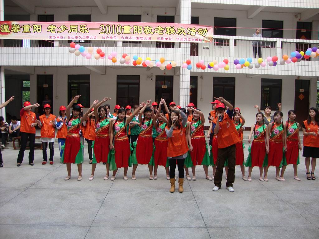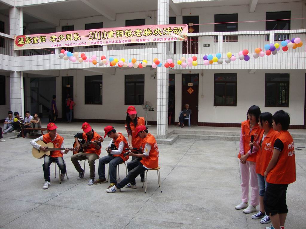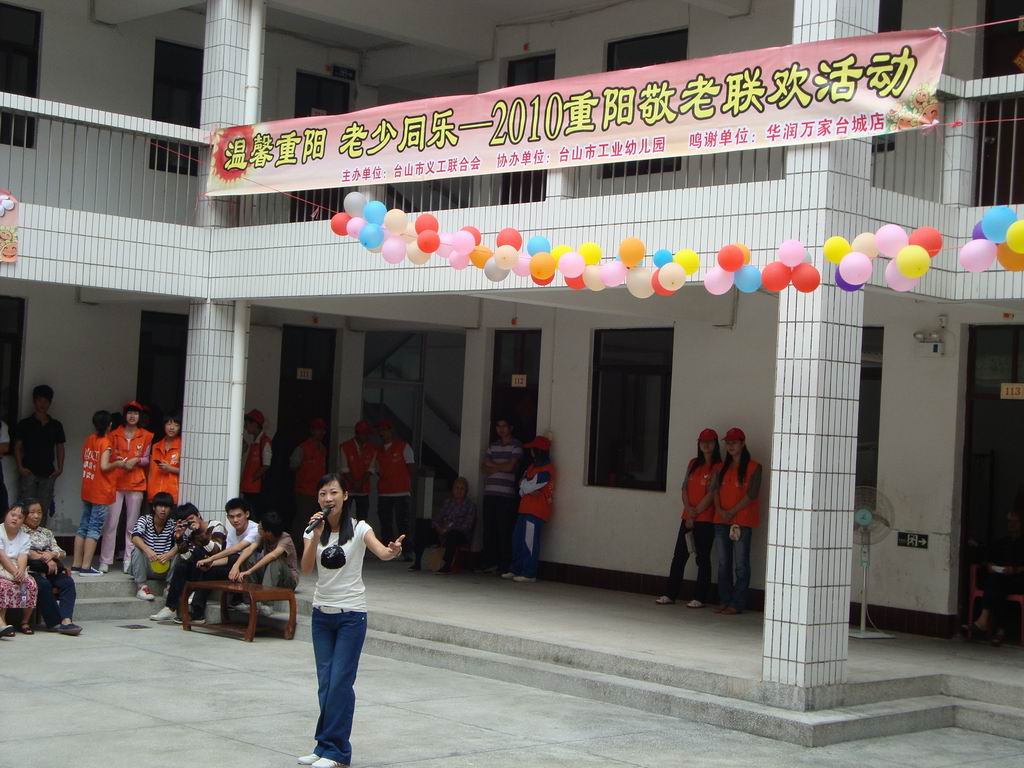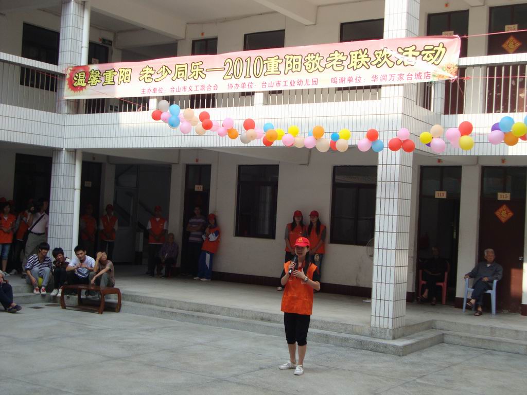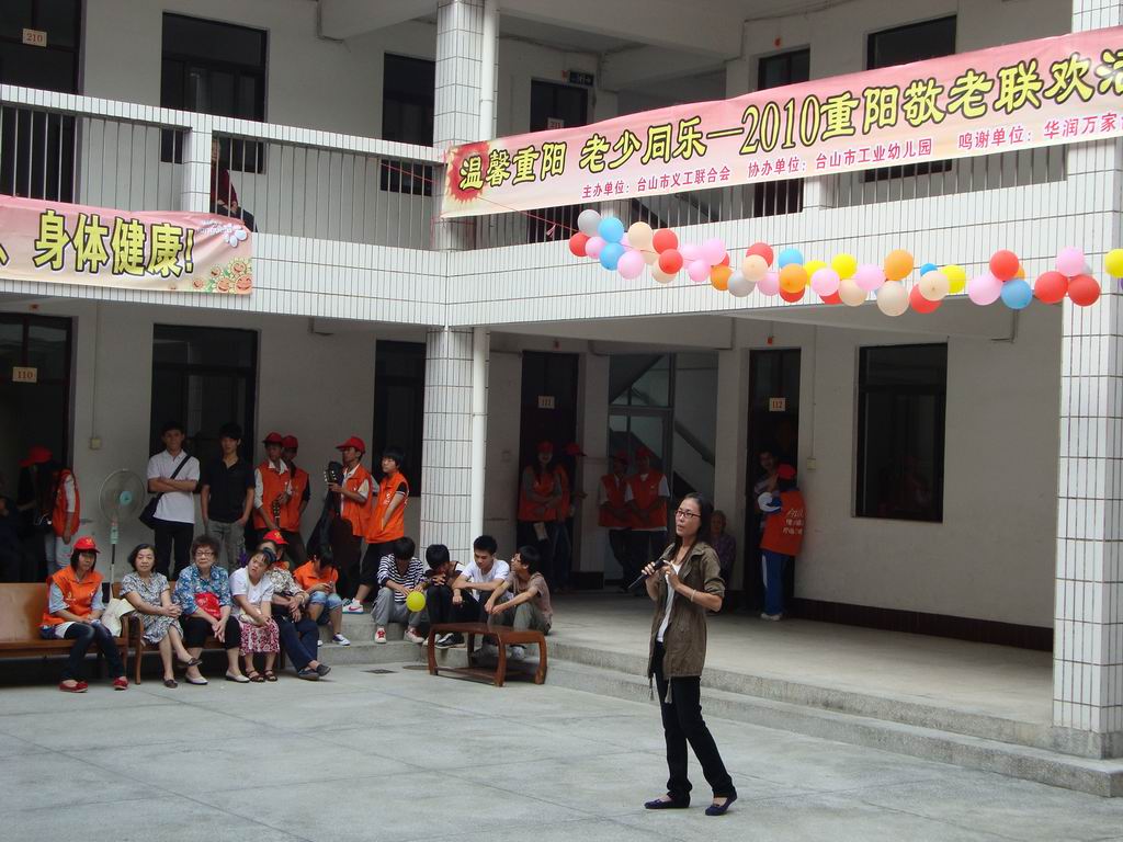 10月16号下午,由市义工联主办、华润万家台城店和市工业幼儿园协办的“温馨重阳,老少同乐——2010重阳敬老联欢活动”在台城敬老院举行,市义工联组织了40多名义工到台城敬老院进行慰问,当天,文艺义工们和工业幼儿园的师生们为老人们表演了丰富多彩的文艺节目,期间还和老人家们玩起小游戏。华润万家台城店的义工们还为老人家们送上了丰富的小礼品。老人们长时间居住在敬老院里,难得的如此热闹,都显得格外的兴奋,他们都希望义工们能多抽时间来探望他们,哪怕只是聊聊天,而很多义工都表示愿意多抽时间来陪陪老人家。